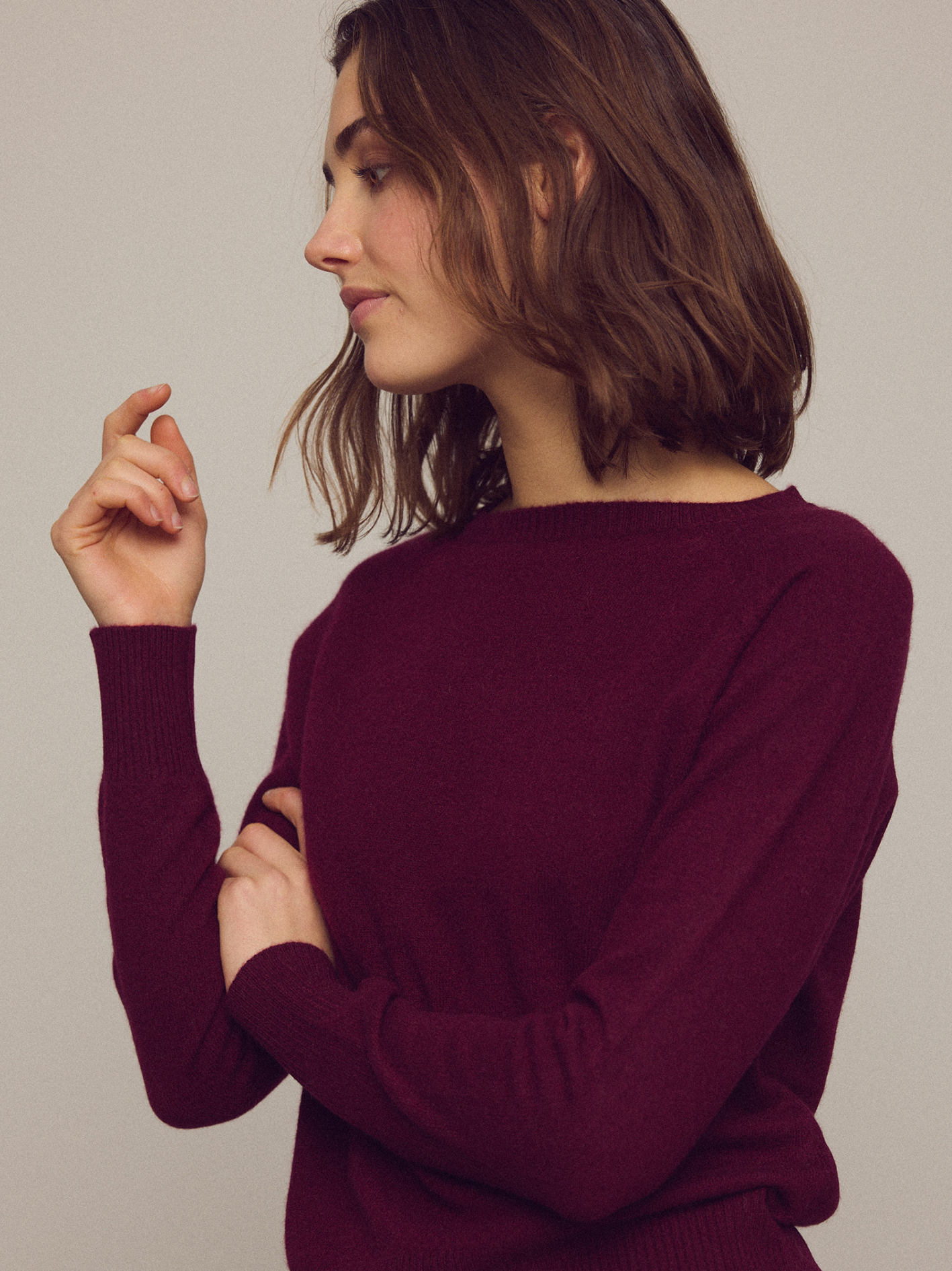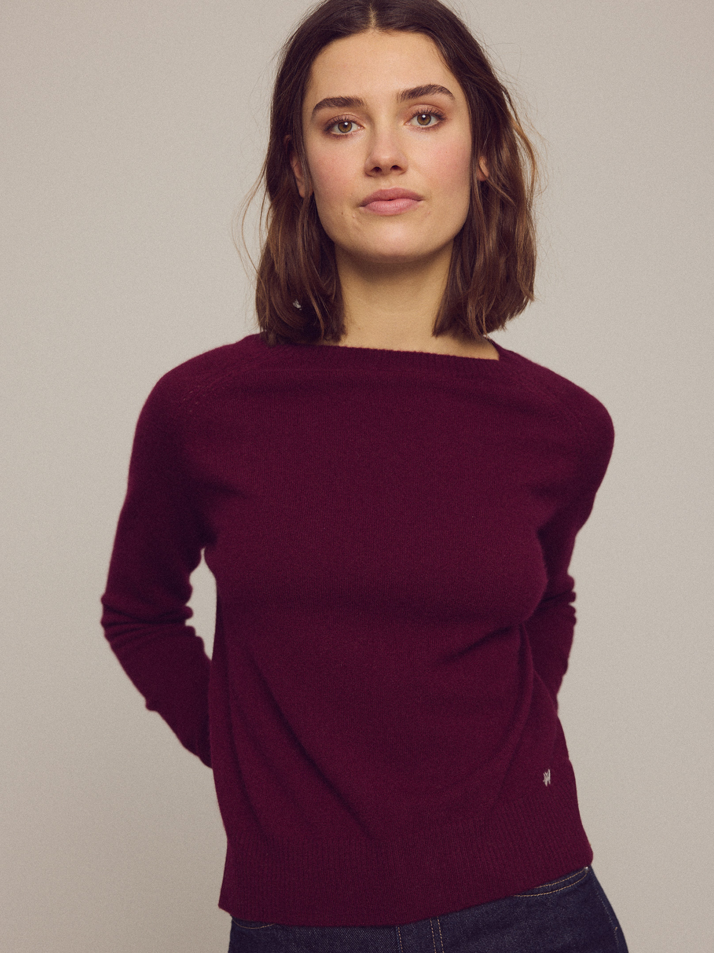 Klassisk, luksus cashmere sweater med bådhals i 100% cashmere fra Indre Mongoliet med lange raglanærmer, pointelle-detaljer ved skulderne og ribstrikket ved hals, manchetter og kant.